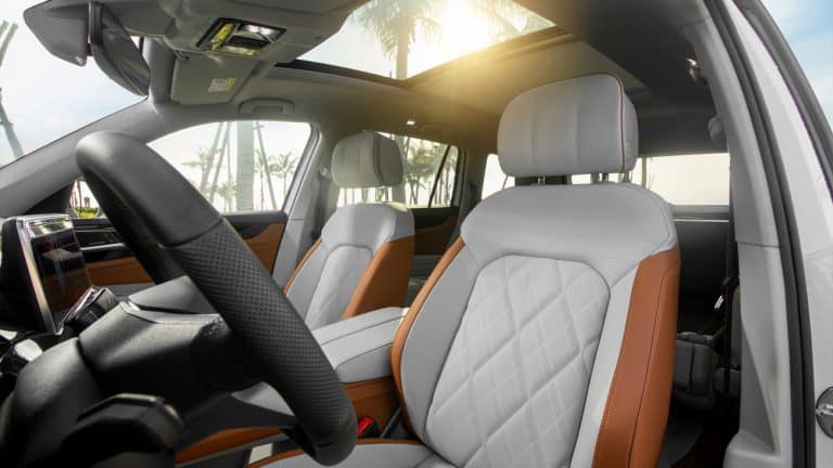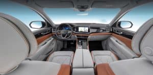 Bước vào bên trong, bạn sẽ bị ấn tượng bởi không gian nội thất rộng rãi và sang trọng của Teramont President. Chất liệu da cao cấp được áp dụng ở nhiều bề mặt tiếp xúc. Mặt táp lô được thiết kế kiểu sao băng rơi cùng dòng chữ Teramont, đi liền với hệ thống đèn Ambient light 30 màu tạo nên một không gian ấm cúng và đẳng cấp.