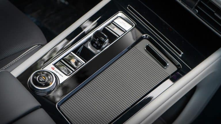 Khu vực điều khiển trung tâm thiết kế lớn với công tắc chuyển số điện tử nhỏ gọn và sang trọng, nút khởi động start/stop thiết kế thuận tiện trong tầm tay.