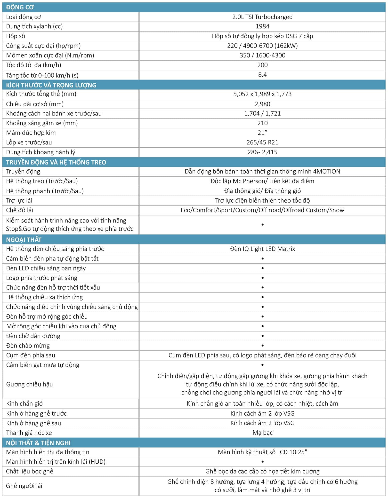 Động cơ 2.0 TSI Turbo tăng áp và phun nhiên liệu trực tiếp. Công suất tối đa 220 Hp/ 4900-6700 rpm, Mô men xoắn tối đa 350 Nm/ 1600-4300 rpm, tốc độ tối đa 200 Km/h.