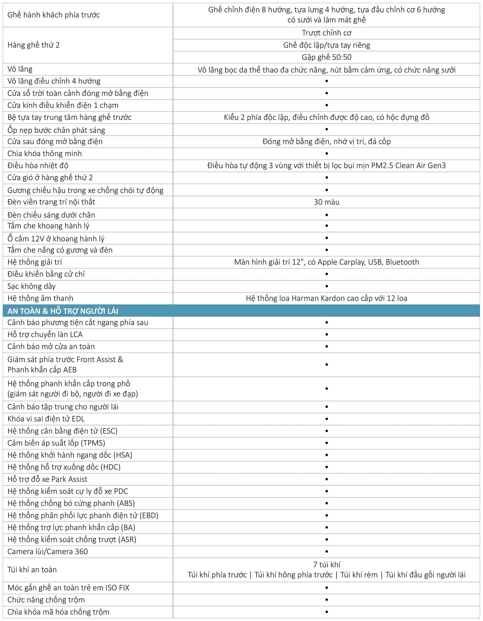 Chức năng làm mát và sưởi ghế trước, chỉnh điện 8 hướng, tựa đầu chỉnh 6 hướng, chức năng bơm hơi tựa lưng 4 hướng, chức năng nhớ vị trí ghế người lái. Hàng ghế thứ 2 độc lập, có tựa tay riêng, ghế trượt lên xuống, có lối đi riêng vào hàng ghế thứ 3.