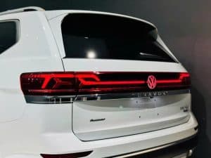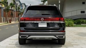 Phía đuôi xe cũng được tô điểm nhấn bởi các thanh viền mạ Chrome và dập nổi tên xe Teramont. Phía dưới cản sau là ống xả kép hình thang mạ crom được đặt bên dưới tấm cản sau. Trên cùng là ăng ten dạng vây cá mập, giúp tăng thêm tính thể thao cho dòng xe SUV này.
